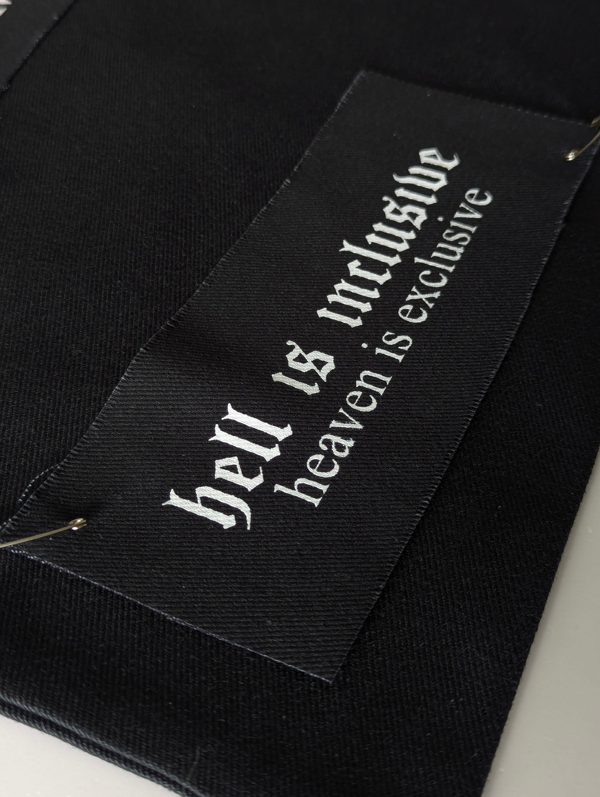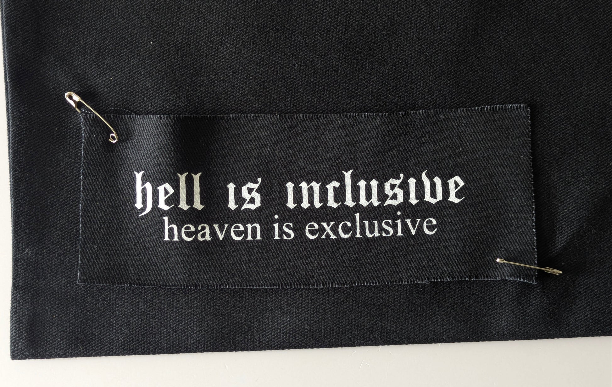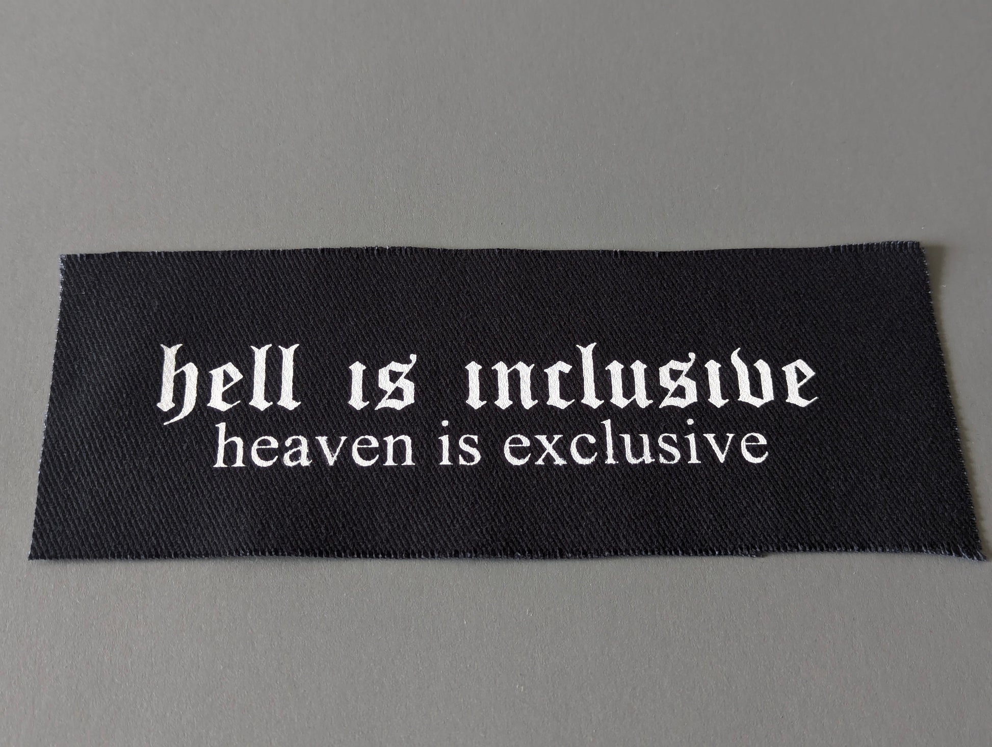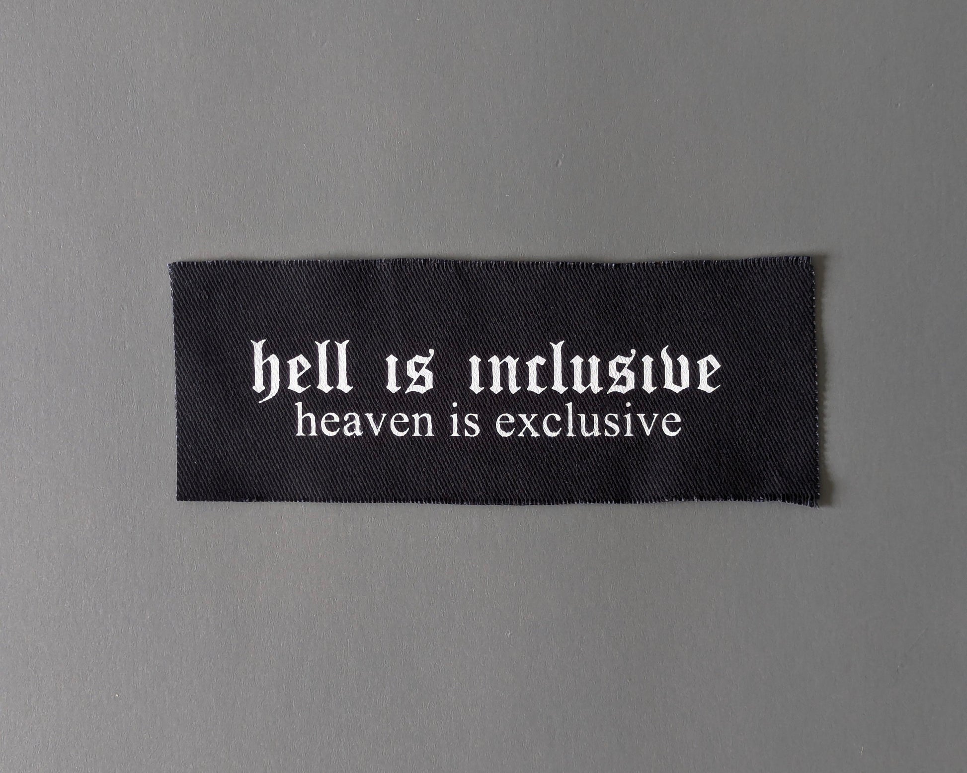 This patch isn't just an accessory; it's a statement. The phrase "hell is inclusive, heaven is exclusive" uses irony to speak to social inclusion, morality, and prejudice.